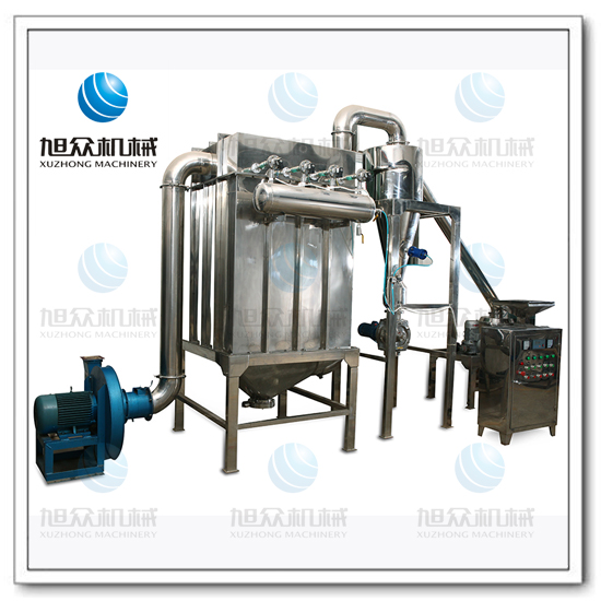 各型號超微粉碎機組都含主機、可調(diào)速的螺旋送料器、旋風收集器加氣錘震蕩裝置、袋式除塵箱加氣流脈沖裝置、引風電機造成負壓。大功率引風電機不但可使輸送管道形成負壓,使達到要求的細粉自動被風力吸入管道,而且巨大的風量還帶走了粉碎腔內(nèi)不斷產(chǎn)生的熱量,同時對粉碎機組的管道起到一個強有力的清理效果。旋風收集器出料口加裝了關風機,出粉口無粉塵飛揚,達到了清潔、環(huán)保、節(jié)約的效果。