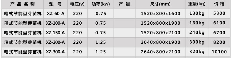 | 型號 | 工作電壓 | 耗水量 | 日耗電(度) | 功率 | 育苗箱 | 重量 | 外形尺寸 |